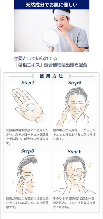 1.洗顔後、適量を手に取り、お顔全体にパッティングして潤いとお肌のさっぱり感を確かめてください。
